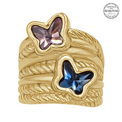 Anillo realizado en zamak, bañado en Oro, con cristales swarovski Light Rose - Denim Blue.