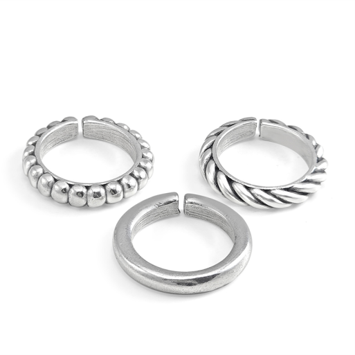 Trío de anillos ajustables, acabado plata.