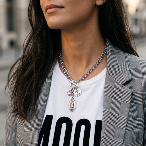 Este collar de la Virgen de Guadalupe es mucho más que una joya; es una pieza con alma que fusiona la devoción tradicional con el diseño contemporáneo de Lamala & Lafea. Con un impecable acabado en plata, la medalla destaca por su relieve detallado, acompañada por un toque de luz inigualable: un cristal Swarovski® en forma de corazón.