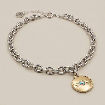 Este collar destaca por su cadena de eslabones gruesos con un sofisticado acabado en plata, aportando un aire contemporáneo y empoderado. En el centro, una medalla con acabado en oro crea un contraste bitono exquisito, elevando cualquier look desde lo casual a lo extraordinario.