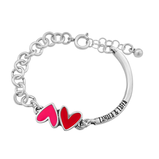 Pulsera realizada en zamak, bañada en plata, esmalte rojo y rosa.